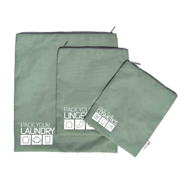 BAG 5310Packing Pouch 3 pcs Set• Material: 100% Polyester• Dimension:Large- 35 x 40 cmMedium- 24.5 x 30 cmSmall- 21 x 25.5 cm• Package: one set in a color box